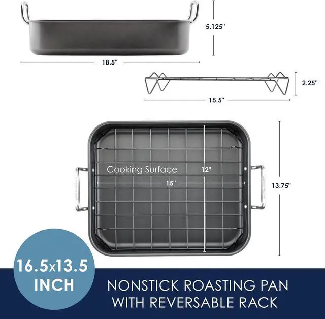 ROASTING PAN SET INCLUDES: 16.5 -inch x 13.5 -inch x 3.5 -inch nonstick roaster, reversible roasting rack
