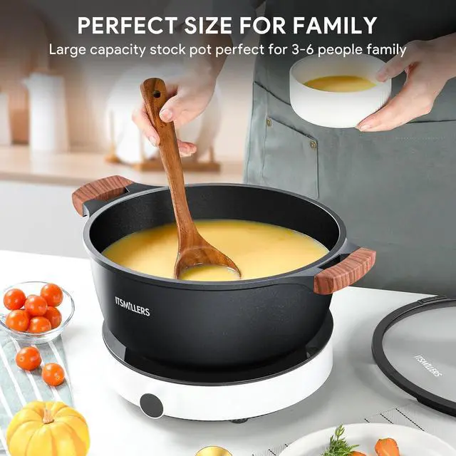STURDY DIE CAST ALUMINUM BODY - The sturdy aluminum die casting body ensures fast and a stable heat distribution during cooking, rapidly heating up, which saves time and energy. Crafted with precision, this ItsMillers stockpot is designed to enhance your cooking experience while adding an elegant touch to your kitchen.