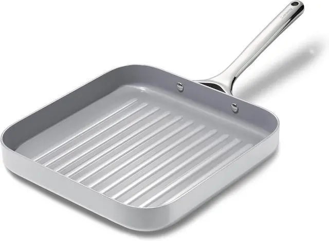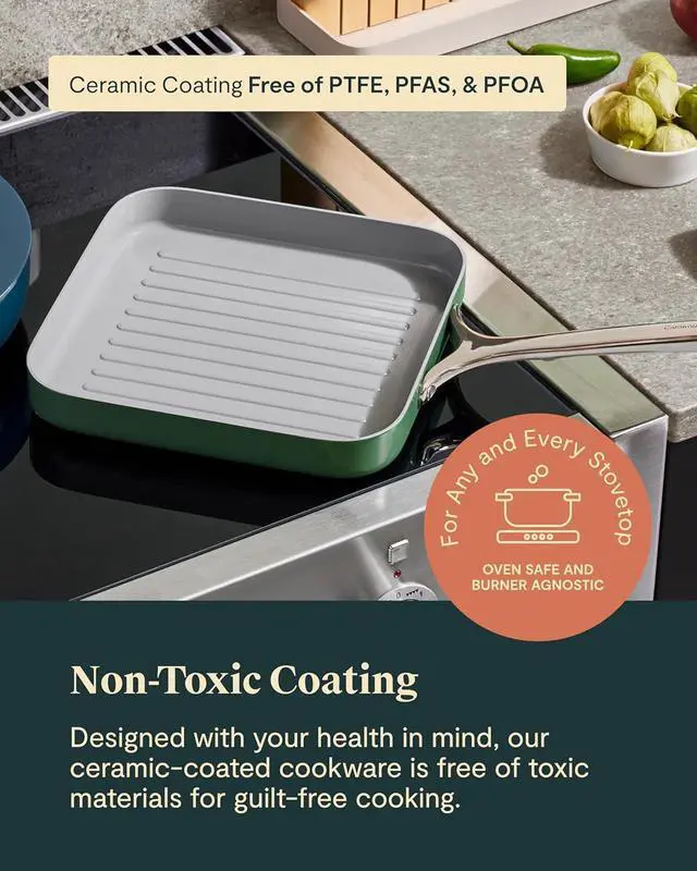 SLICK COOKING SURFACE: Our ceramic coated Grill Pan boasts a naturally slick ceramic coated cooking surface, requiring minimal oil for food to glide smoothly. Compatible with all cooktops, including induction, it' s the perfect addition to your kitchen arsenal.