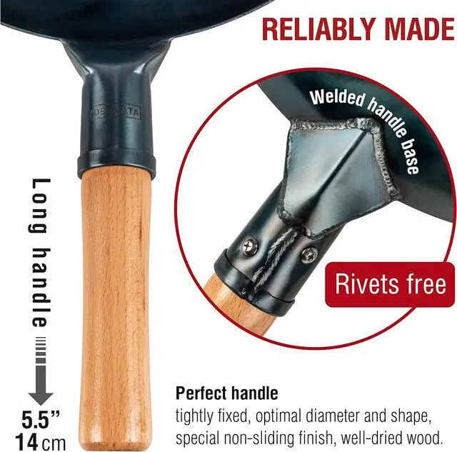 SECURE GRIP: The long handle of our carbon steel wok pan is tightly fixed through welding. Also, it combines optimal diameter and shape, a special non-sliding finish, well-dried wood.
