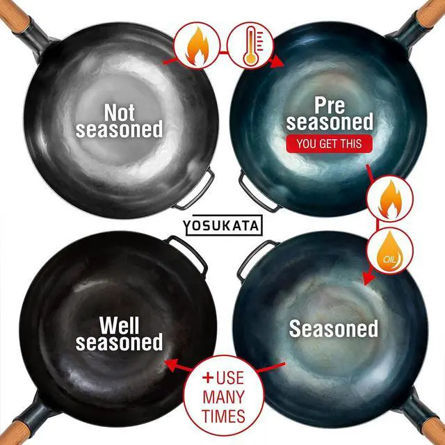 PRE-SEASONED: YOSUKATA large blue carbon steel wok flat bottom pan is pre seasoned at high temperatures over 600F using special technics. It takes just a few minutes to fully season this traditional Japanese pan with oil and start cooking right away. Our outdoor wok is conveniently designed for use as a camping wok, wok BBQ, grill wok