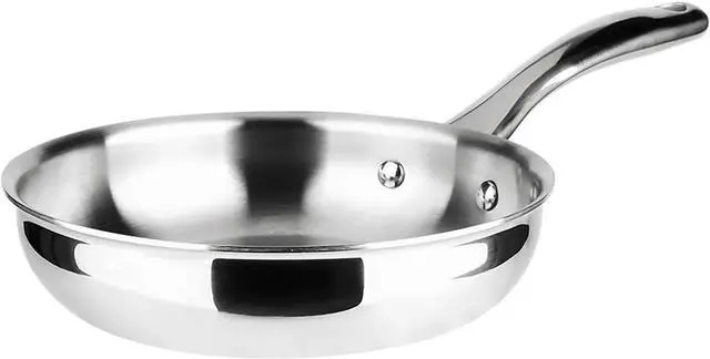 TOP QUALITY FRYING PAN. Stainless steel fry pan is made of 3 kinds of metal. The inner layer is 18/10 food grade stainless steel. The middle layer is aluminum which transfers heat fastly. And the outer layer is 18/0 magnetic stainless steel