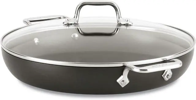 12 inch All-Clad HA1 Hard Anodized Nonstick Fry Pan is ideal for browning, searing, and pan-frying foods like eggs, vegetables, and meats Its flat surface and flared side walls make it ideal for one hand sautéing and easy turning with a spatula