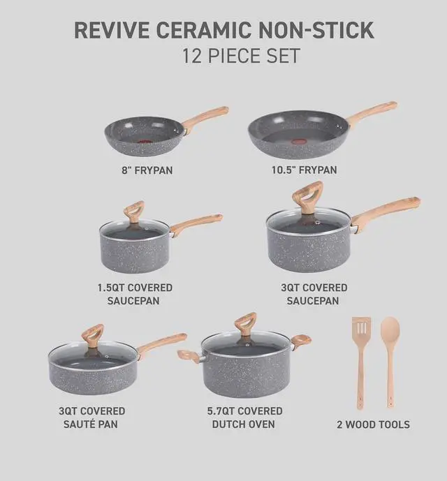 : This ceramic cookware set includes an 8 inch and 10.5 inch frypans, 1.5 quart and 3 quart saucepans with lids, 3 quart sauté pan with lid, 5.7 quart dutch oven with lid, and 2 wooden tools: slotted spatula and solid spoon