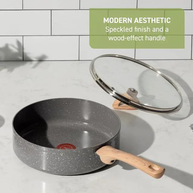 : Made with a 100% recycled aluminum body to help reduce your environmental impact, and featuring T-fals GoCeram ceramic non-stick surface that needs little to no oil for healthier cooking.