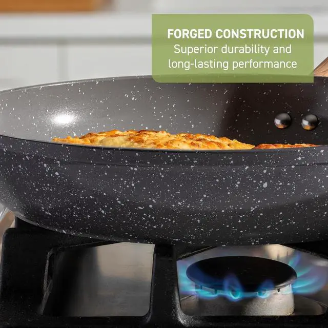 , : The forged body provides durability and long-lasting performance and the soft-touch, wood-look handles offer a secure grip. A speckled coating adds an organic modern touch, and vented glass lids allow for visibility while cooking