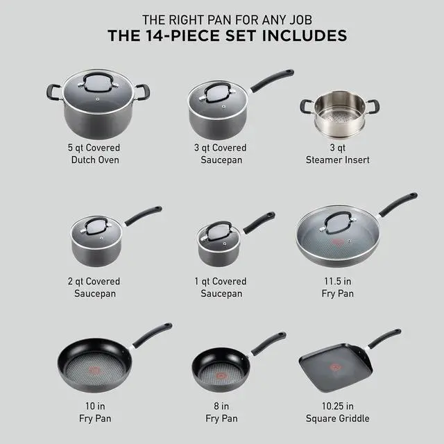 Our Pots and Pans Set Non Stick Includes: 1 quart 2 quart, and 3 quart covered saucepans, 8 and 10 inch frypan, 11.5 inch covered frypan, 10.25 inch griddle, 3.5 quart saute pan, 5 quart dutch oven, 3 quart steamer insert, and one egg wonder frypan.