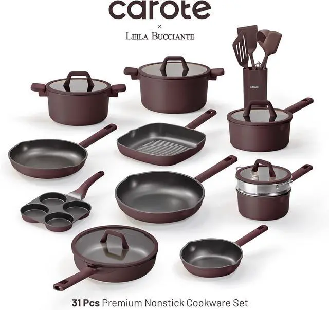Set Includes: 8'' fry pan, 9.5'' fry pan, 11'' fry pan, 2-qt saucepan with lid, 3-qt saucepan with lid, 4-qt stockpot with lid, 6-qt stockpot with lid, 4.5-qt sauté pan with lid, egg pan, ladle, fish turner, solid turner, spatula, whisk, steamer, 9*pan protectors, container.