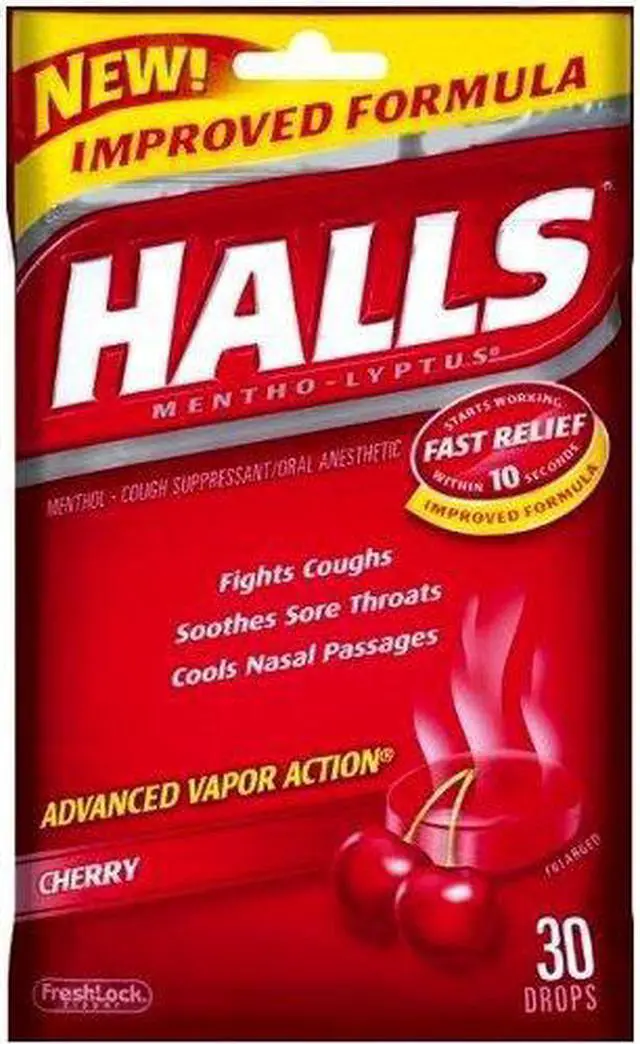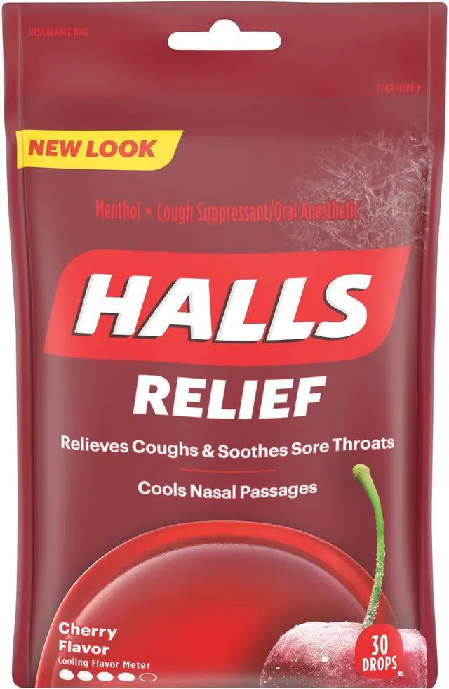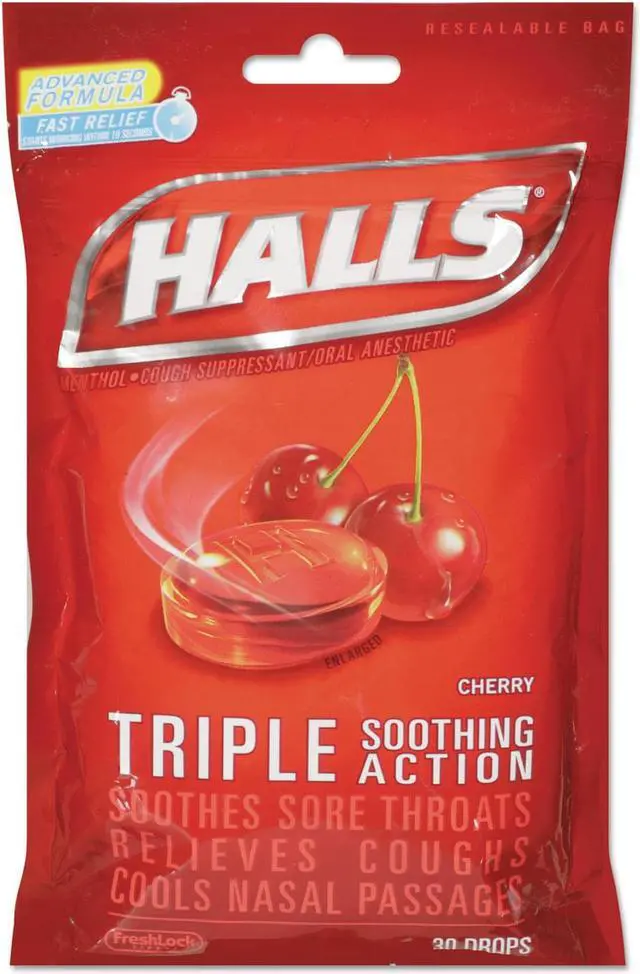 Triple action cough drops work to battle uncomfortable coughs three different ways, fighting coughs, soothing sore throats and cooling nasal passages. Advanced Vapor Action formula provides relief for your achy throat. At only 15 calories and 4 grams of carbohydrates per drop, its guilt-free relief. 30 cough drops per bag. Contains: 30 Drops; Description: Cherry.