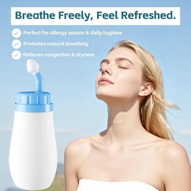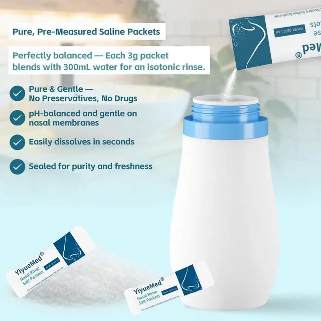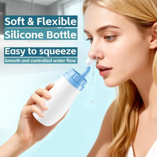 This 300 mL soft-squeeze silicone bottle with 60 pre-measured saline powder packets is designed for smooth, gentle nasal rinsing. Ideal for daily nasal hygiene, especially during allergy season or dry air conditions.
