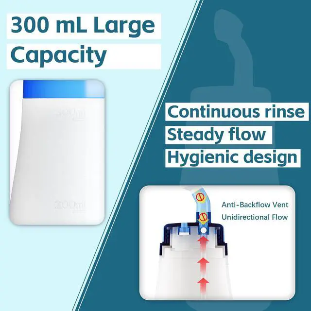 Crafted from premium silicone material, this soft and flexible bottle allows smooth, controlled water flow with gentle squeezing. Its ergonomic shape fits naturally in your hand, and the integrated anti-backflow vent helps promote a clean, one-way rinse experience.