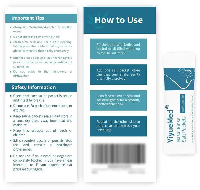 Each packet is pre-measured for 300 mL of water to create a gentle isotonic saline rinse when used as directed. Fill the bottle with lukewarm distilled water or previously boiled-and-cooled water, add one packet, close the cap, and shake gently until fully dissolved.