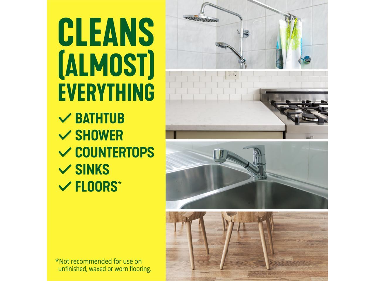 - Multipurpose cleaner is safe for use on countertops, sinks, garbage disposals, floors, sealed wood surfaces, furniture, walls, doorknobs, showers, tubs, toilets, exterior surfaces and more.