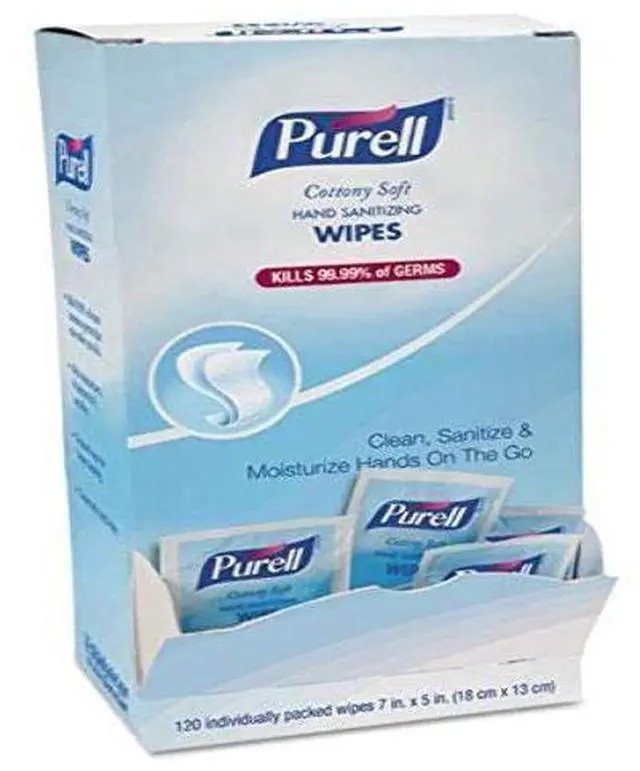 Clean, sanitize and moisturize hands on-the-go with PURELL Cottony Soft Sanitizing Wipes. Thick wipes are textured better cleaning. 62 percent ethyl alcohol formula kills 99.99 percent of most common germs that may make you sick. Moisturizers, Vitamins A and E and aloe help maintain healthy skin. Individually wrapped wipes are convenient and easy to use in offices, restaurants, healthcare facilities or anywhere else germs might be.