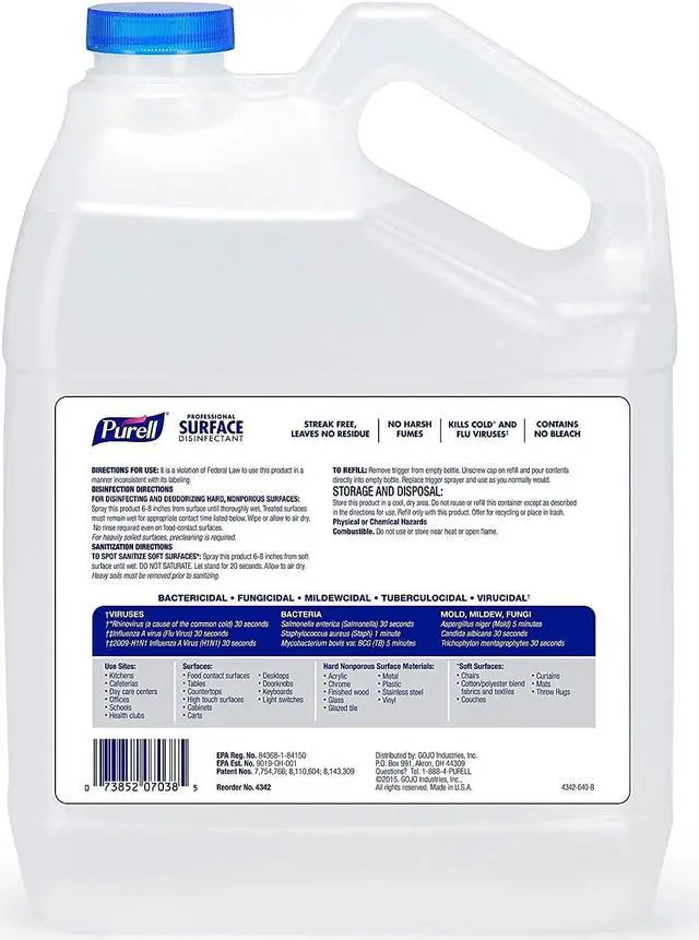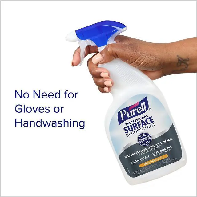 Formulated for convenience and ease-of-use, PURELL Professional Surface Disinfectant has powerful germ-kill on the surfaces people touch most. It kills 99.9 percent of viruses and bacteria including cold and flu, strep, norovirus, Listeria, MRSA, VRE, and human coronavirus. Designed to accelerate the germ-killing power of alcohol, it dissipates quickly and cleanly with no streaks or sticky residue. The light, citrus fragrance gives you the peace of mind to use around others. PURELL Professional Surface Disinfectant is a one-step disinfectant formulated to kill germs on both hard and soft surfaces no rinse required even on food-contact surfaces.