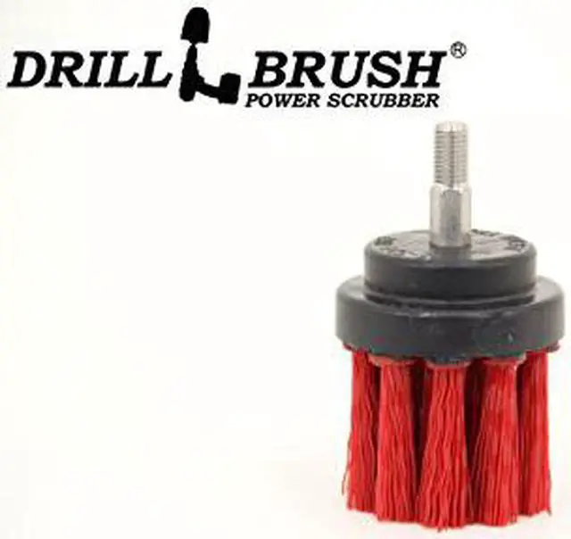 2 inch diameter drill powered scrubbing brush features longer nylon bristles, rugged construction, and a dual purpose stainless steel shaft. This brush fits securely in battery powered drills. Red stiff bristles are designed for heavy duty scrubbing and tough stains on garage floors, brick and concrete. See our 4 and 5 inch red stiff drillbrushes in our store.