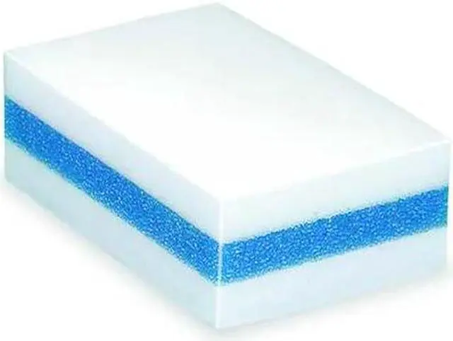 Sponge, Material Melamine Foam, Product Type Erasing Pad, Overall Length 4 3/8 in, Overall Width 2 3/4 in, Overall Height 1 1/2 in, Thickness 1 5/8 in, Antimicrobial No, Handle Material Not Applicable, Handle Color Not Applicable, Pad Color Blue/White, Series Not Applicable, Standards Not Applicable, Application Multipurpose, Includes Handle, Includes Handle No, Resistance Properties Mildew Resistant, Package Quantity 24. This item has been restricted from sale in the following state (s): []