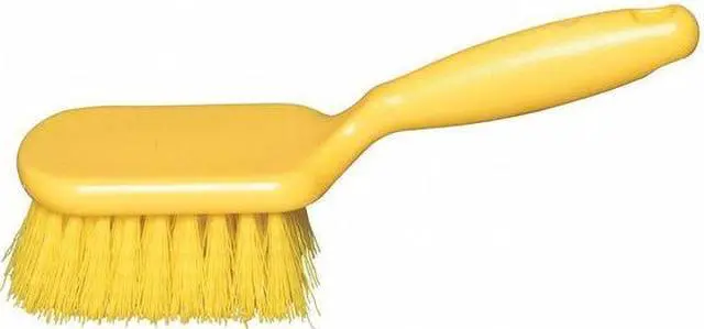Scrub Brush, Bristle Firmness Stiff, Handle Style Angled, Bristle Material Polypropylene, Handle Material Plastic, Brush Length 4 1/4 in, Handle Length 5 1/2 in, Head Width 3 1/2 in, Bristle Color Yellow, Overall Length 10 in, Chemical Resistant Yes, Bristle Length 1 3/4 in, Brush Type Scrub Brush, Handle Color Yellow, Temperature Resistant Yes, FDA Compliant Yes, Acid Resistant Yes, Color Coding System Yes