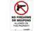 California Proposition 65: This product contains a chemical known to the State of California to cause birth defects or other reproductive harm. Safety Sign, Horizontal Rectangle, Number of Printed Sides 1, English, Sign Legend No Firearms Or Weapons Allowed On This Property, Sign Legend Background Color White, Sign Legend Style Symbol and Text