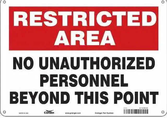 Safety Sign, Horizontal Rectangle, Number of Printed Sides 1, English, Sign Format Other Format, Sign Legend No Unauthorized Personnel Beyond This Point, Sign Legend Background Color Red, White, Sign Legend Style Text