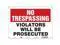 Safety Sign, Horizontal Rectangle, Number of Printed Sides 1, English, Sign Format Other Format, Sign Legend Violators Will Be Prosecuted, Sign Legend Background Color Red, White, Sign Legend Style Text