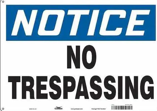 Safety Sign, Horizontal Rectangle, Number of Printed Sides 1, English, Sign Format Traditional OSHA, Sign Legend No Trespassing, Sign Legend Background Color White, Sign Legend Style Text