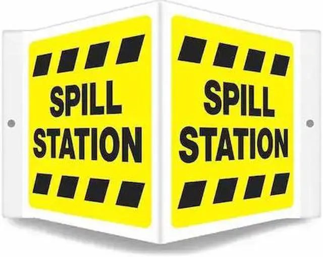 High Visibility Safety Sign, V-Shape Projection, Number of Printed Sides 1, English, Sign Legend Spill Station, Sign Legend Background Color Yellow, Sign Legend Style Text