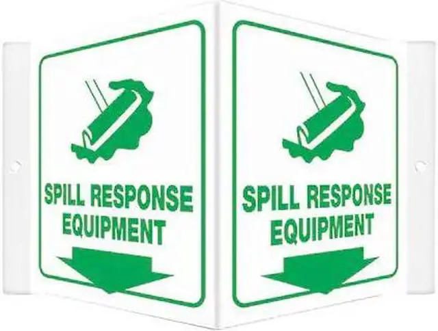 High Visibility Safety Sign, V-Shape Projection, Number of Printed Sides 1, English, Sign Legend Spill Response Equipment, Sign Legend Background Color White, Sign Legend Style Symbol and Text