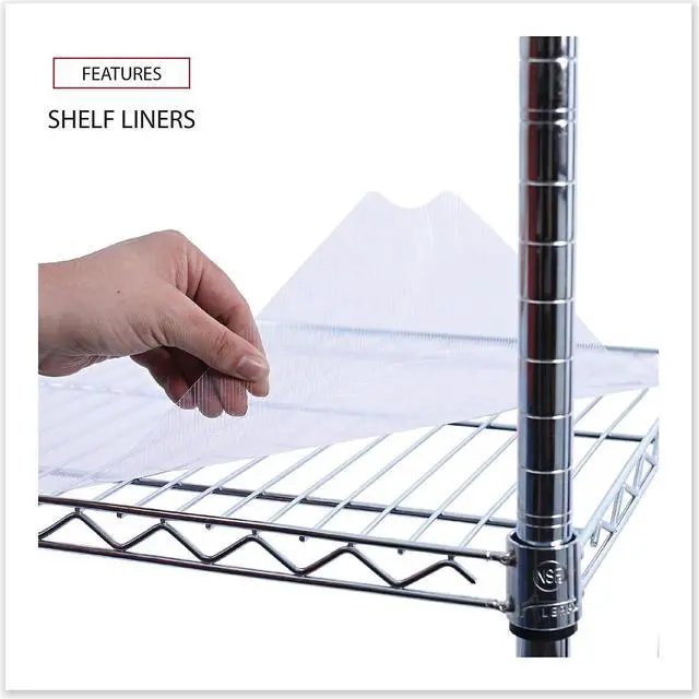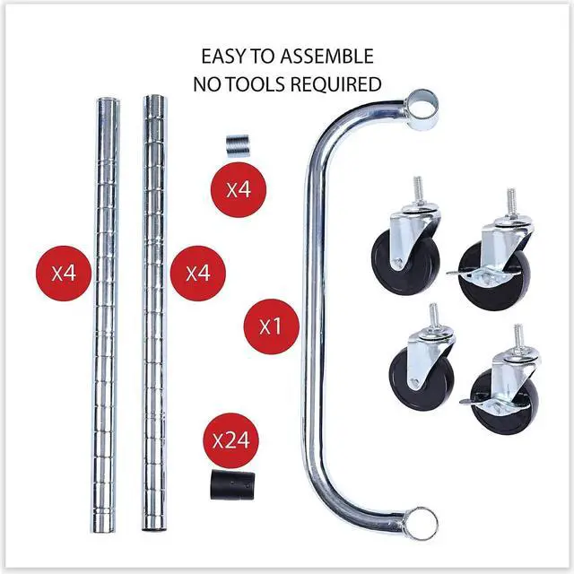 Three adjustable shelves with pull handle. Includes three shelf liners, four 35" poles and four casters (two locking). Shelves adjust in 1" increments. Includes three shelf liners and four casters (two locking) for mobility. 500 lbs. total weight capacity on casters. Easy to assemble -- no tools required.