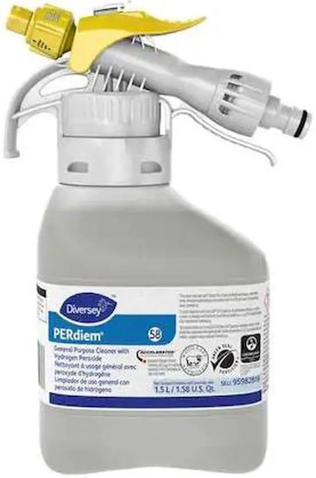 Neutral All Purpose Cleaner, Label Number 58, Label Color Coding Blue, Chemical Series PERdiem, Cleaner Form Liquid, Compatible Mfg. Model Number D1226566, Container Size 1.5 L, Container Type Hose End Sprayer, Fits Dispenser Series RTD Spray, NSF Rating Not Rated, pH Level 1, pH Value Acidic, Primary Chemical Hydrogen Peroxide, Recommended Dilution 1:64, Concentrated, Properties Butyl Free, Nonflammable, Flash Point 200 Degrees F, VOC Content 0 Percent, Fragrance Unscented, Standards CFIA. This item has been restricted from sale in the following state (s): []
