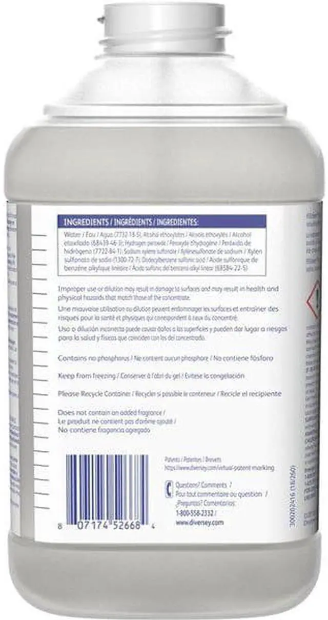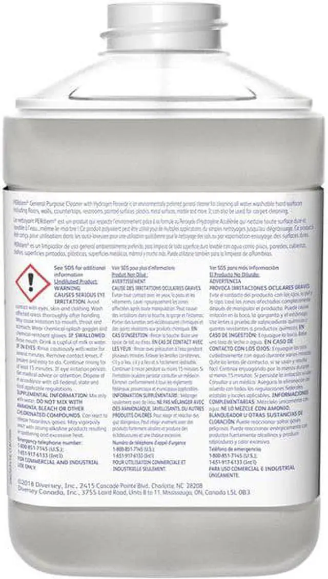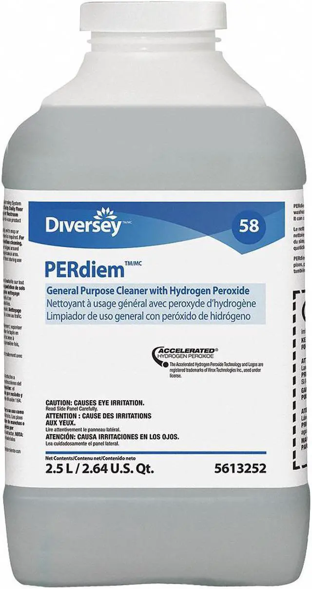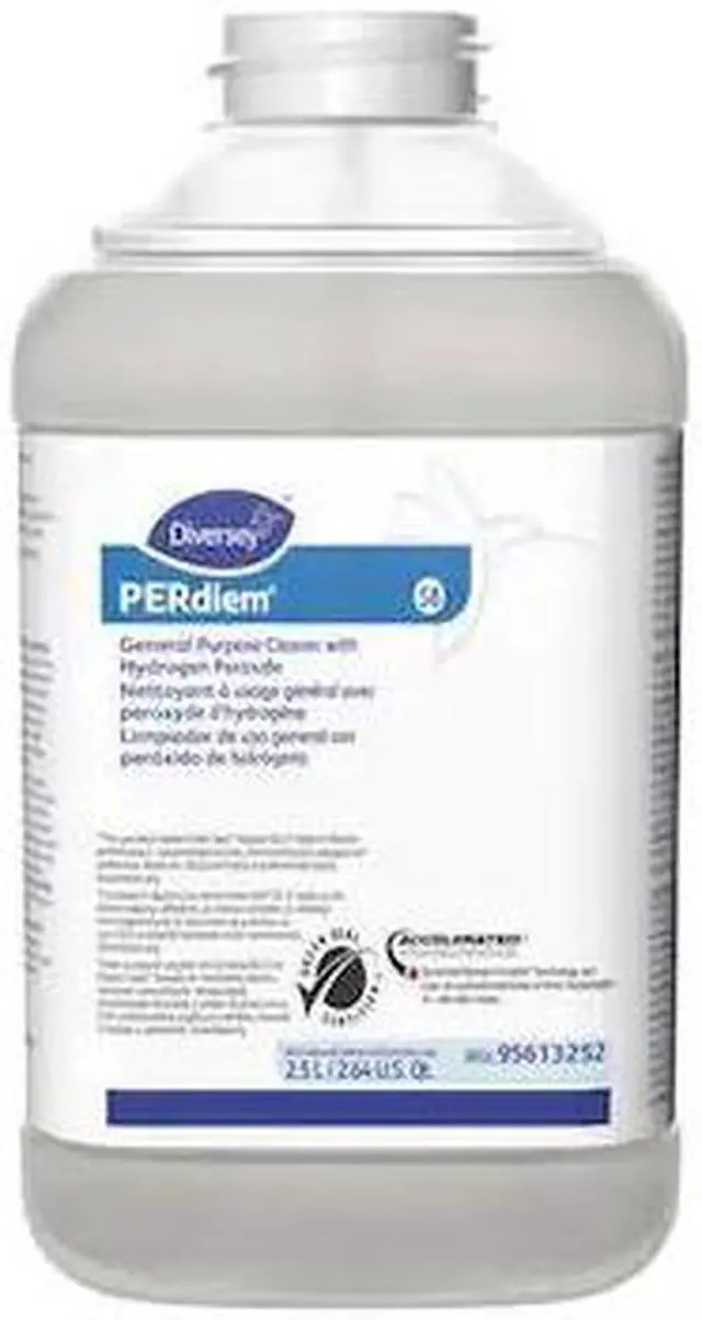All Purpose Cleaner, Label Number 58, Label Color Coding Blue, Chemical Series PERdiem, Cleaner Form Liquid, Container Size 2.5 L, Container Type Bottle, Fits Dispenser Series J-Fill, NSF Rating Not Rated, pH Level 6.2, pH Value Neutral, Primary Chemical None, Recommended Dilution 1:256, 1:64, Concentrated, Properties Butyl Free, Nonflammable, Flash Point 200 Degrees F, VOC Content 0 Percent, Fragrance Unscented, Standards CFIA, Surfaces for Use On Glass, Marble, Package Quantity 2