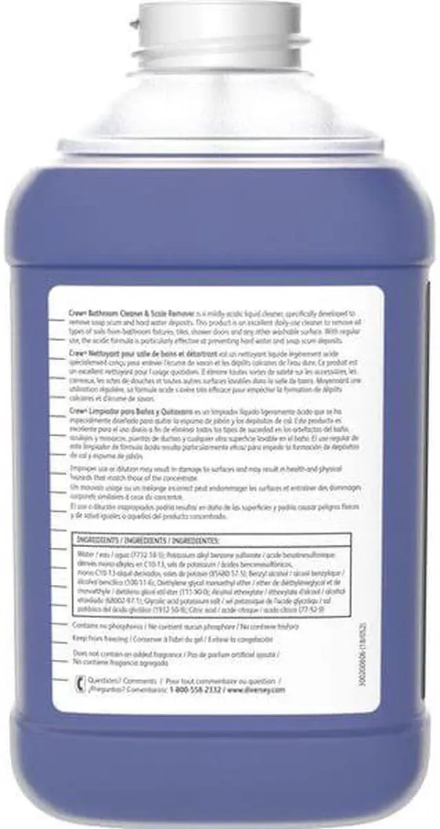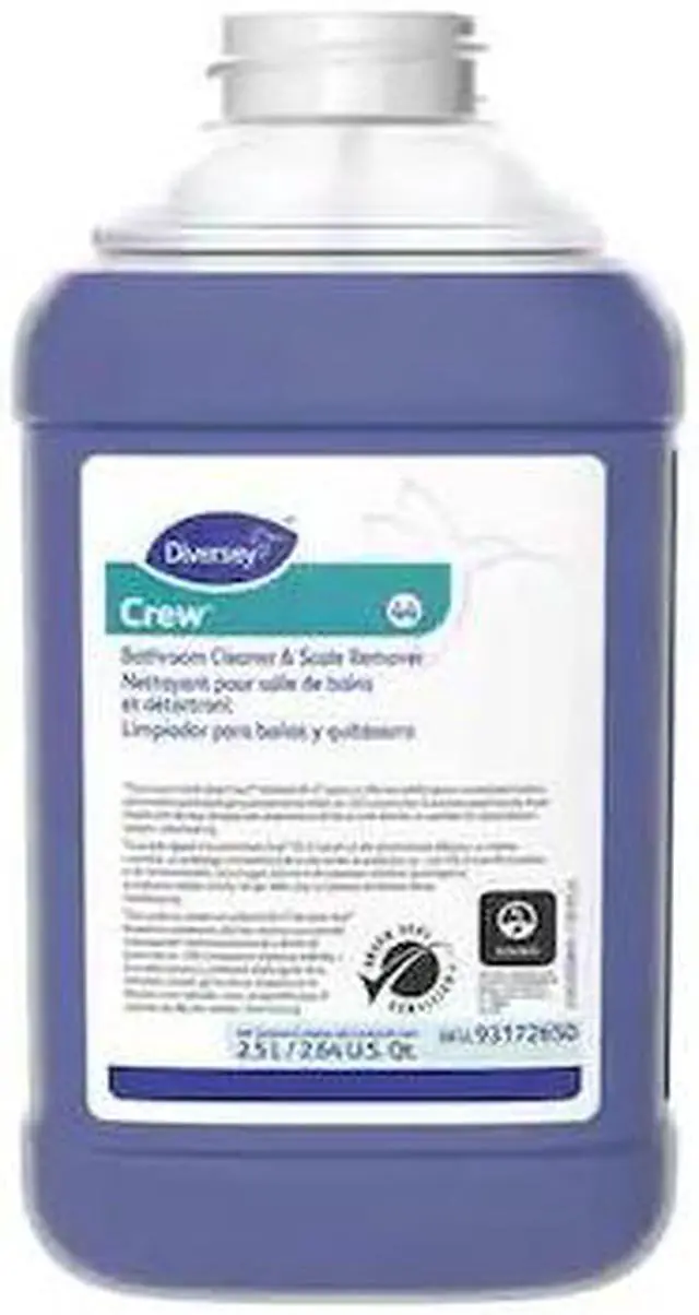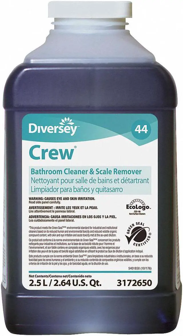 Bathroom Cleaner, Label Number 44, Label Color Coding Blue, Chemical Series Crew, Cleaner Form Liquid, Container Size 2.5 L, Container Type Bottle, Fits Dispenser Series J-Fill, NSF Rating Not Rated, pH Level 4.38, pH Value Acidic, Primary Chemical None, Recommended Dilution 1:18, Concentrated, Properties Butyl Free, Nonflammable, Flash Point 93.4 Degrees F, VOC Content 0 Percent, Fragrance Unscented, Standards EcoLogo, Surfaces for Use On Hard Nonporous Surfaces, Glass, Tile, Package Quantity 2