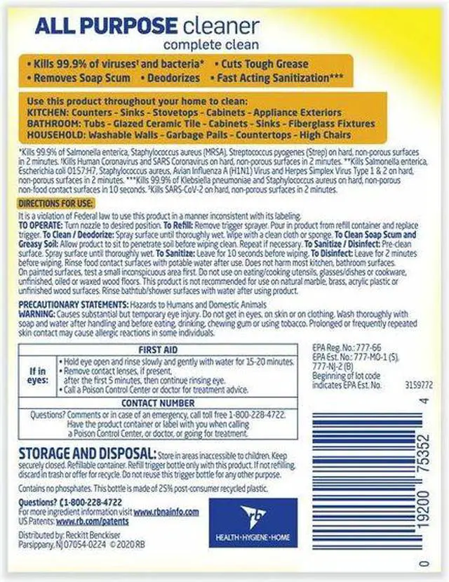 All Purpose Cleaner, All Purpose Cleaner, Surfaces for Use On Hard Nonporous Surfaces, Plastics, Wood, Trigger Spray Bottle, 32 oz, Fragrance Lemon Breeze, Ready to Use/Concentrated Ready to Use, Recommended Dilution Ready to Use, Primary Chemical Quat, Liquid, Standards EPA Registered, TSCA Compliant, Biodegradable Yes, Color Yellow, Butyl Free No, VOC Content 0 Percent, Flash Point Greater than 200 Degrees F, NSF Rating Not Rated, pH Level 10.5, 11.3, pH Value Alkaline