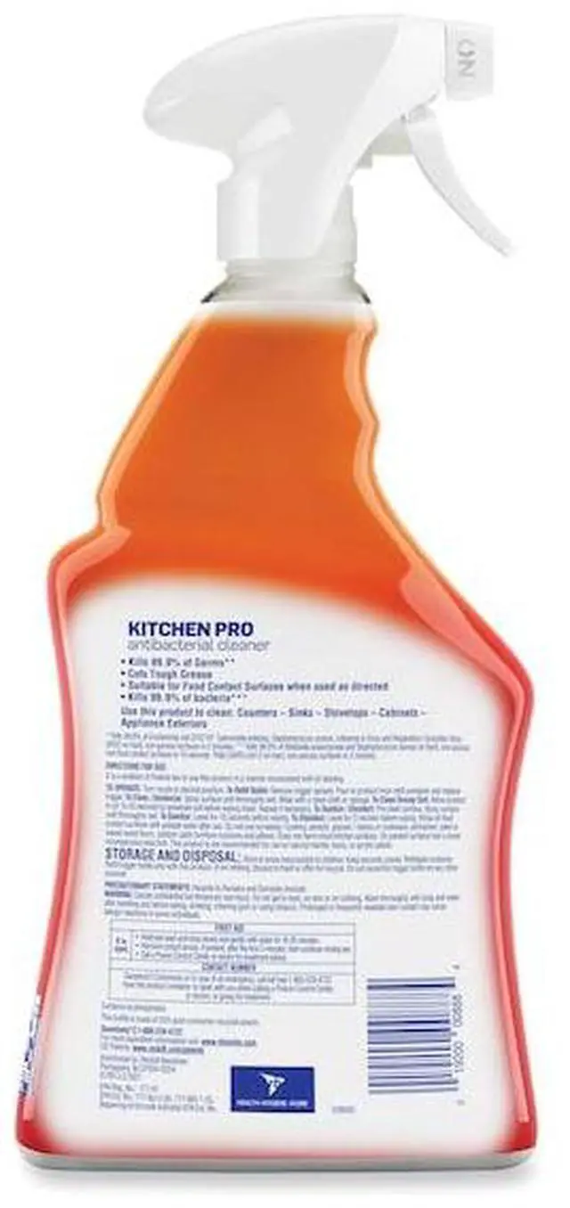 Kitchen Cleaner, Kitchen Cleaner, Surfaces for Use On Hard Nonporous Surfaces, Trigger Spray Bottle, 22 oz, Fragrance Citrus, Ready to Use/Concentrated Ready to Use, Recommended Dilution Ready to Use, Primary Chemical Quat, Liquid, Standards EPA Registered, TSCA Compliant, Biodegradable Yes, Color Orange, Butyl Free No, VOC Content 0 Percent, Flash Point 200 Degrees F, NSF Rating Not Rated, pH Level 10.3, 11.5, pH Value Alkaline, Product Series No Series, Rinse Required Yes, Nonflammable Yes