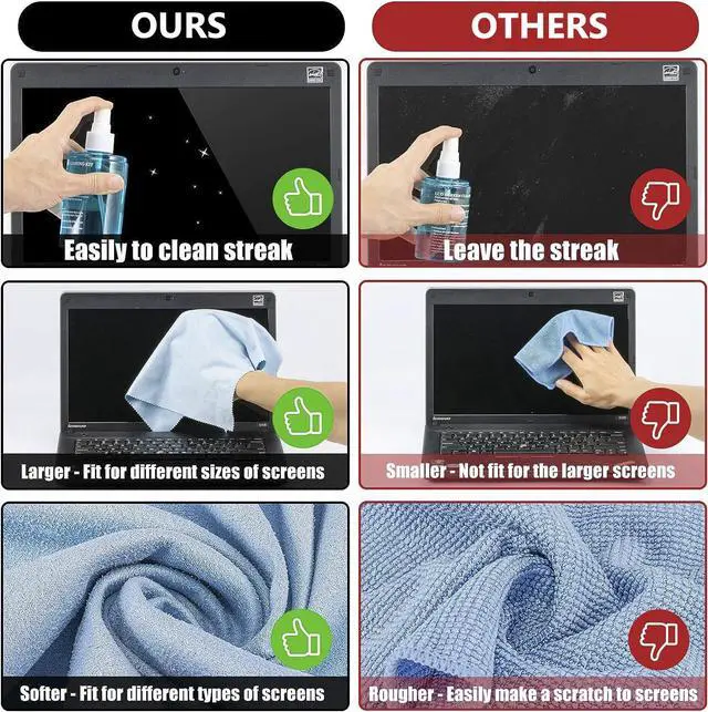 Cleaning tool Includes 2 of bottles of 200ml ( 6.76oz ) refill screen cleaner spray and 2 of large soft plush glasses clean cloth. Regularly cleaning your screen, the tv screen cleaner kit can effectively remove these marks, smudges and fingerprints, leading to a clearer and more visually appealing display.