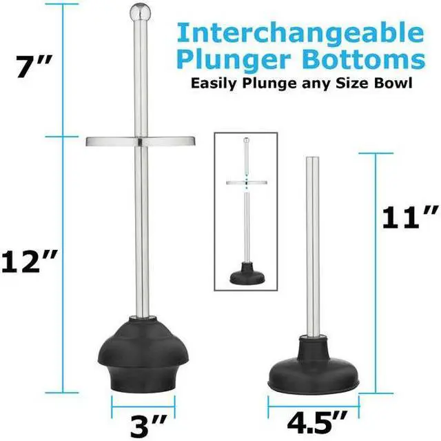 Modern Sleek Design Compact and space saving modern design keeps your toilet brush and plunger hidden while providing sanitary storage. Unique stylish oval design will perfectly accessorize any bathroom style. Heavy Duty Toilet Plunger Included are two interchangeable rubber toilet plunger heads, which create a tight seal on toilets when in use for maximum unclogging support. Toilet plungers work on modern and old-fashioned toilets. Highly Efficient Toilet Brush Included are two interchangeable brushes with dense strong bristles that make scrubbing a lot easier and efficient in hard to reach places around the toilet bowls rim.