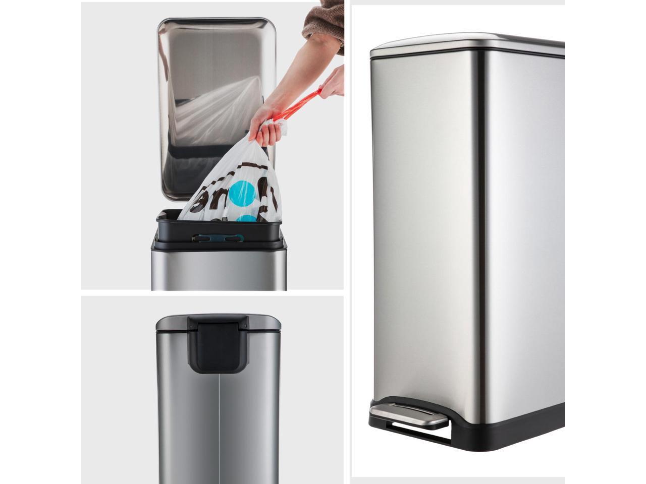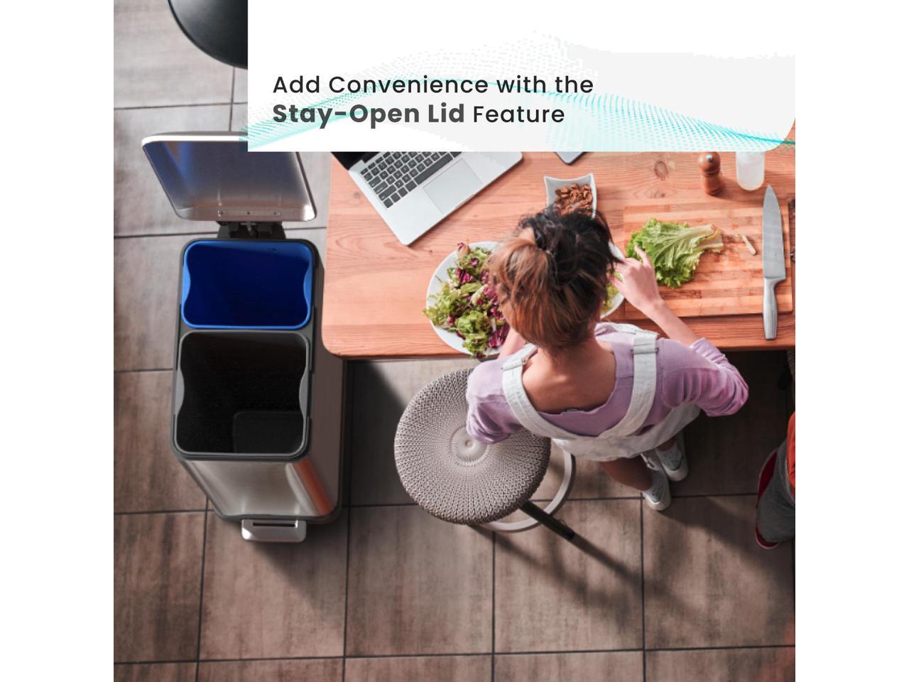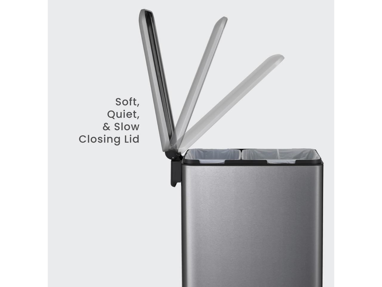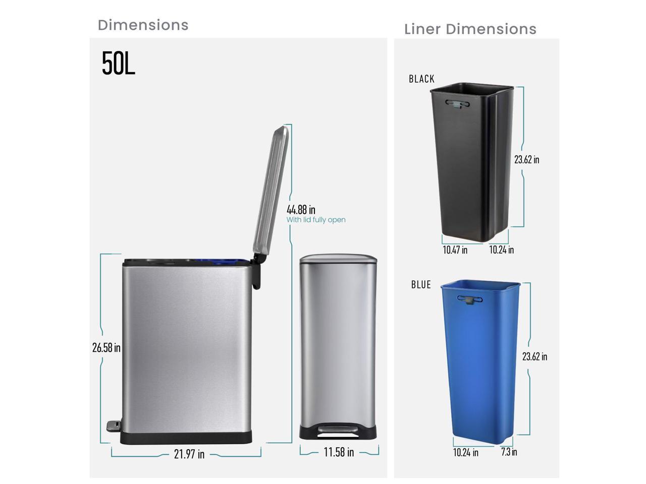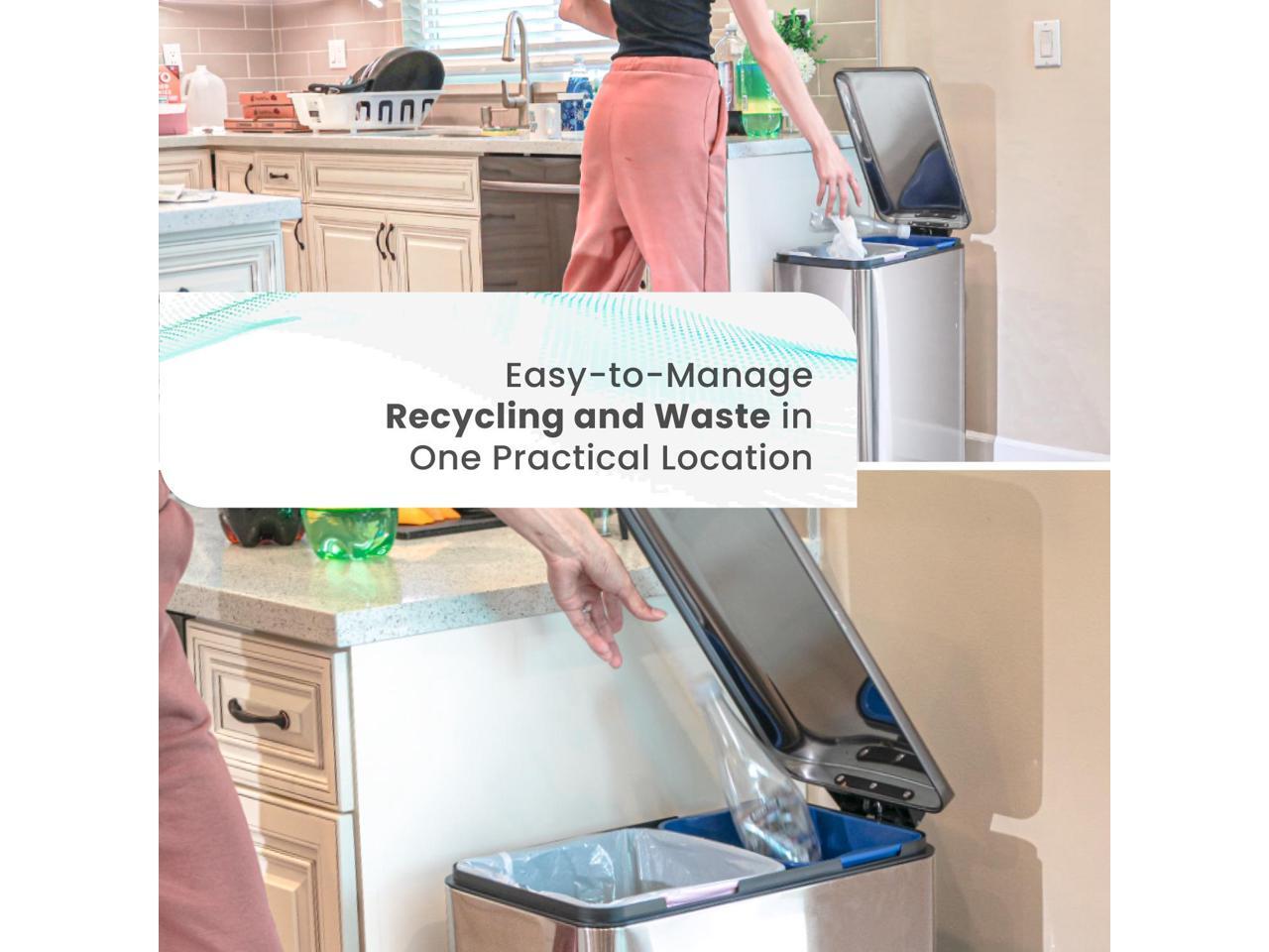 - Recycling Made Simple Efficiently sort your trash and recyclables with dual compartments. The waste compartment holds up to 8 gallons, while the recyclable holds just over 5 gallons for a total of 13 gallons