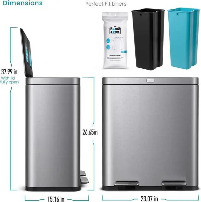 Home Zone Living 15.8 Gallon Kitchen Trash Can, Dual Removable Liners for Recycling and Trash, CleanAura Odor Control, Wide Stainless Steel Shape (7.9 + 7.9 for 15.8 Gallon Total)