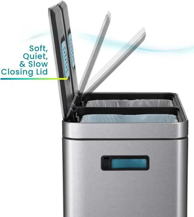 Efficiently sort your trash and recyclables with easy-to-access dual compartments. The waste compartment holds up to 8 gallons, while the recycling compartment holds just over 5-gallons for a total of 13-gallons.