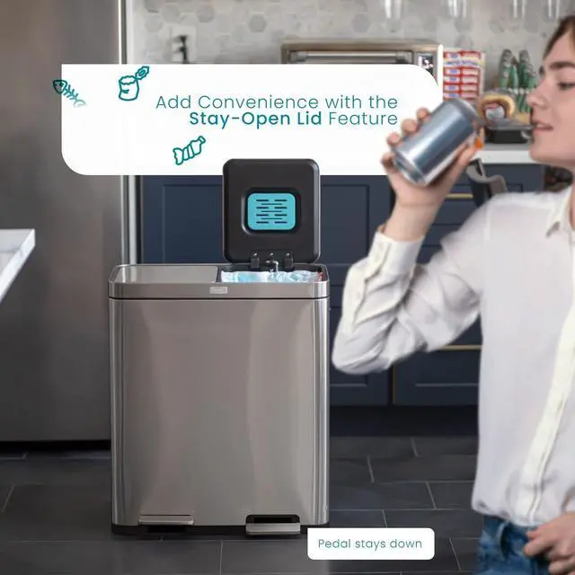 Give your kitchen a fresh new look, while keeping it smelling clean. This dual compartment trash can and recycling combo packs quite a punch. First, the dual 8-gallon compartments allows you to store both waste and recycling in separate containers. Both sides feature the CLEANAURA odor control compartment that helps keep foul odors where they belong, inside the trash can. Each compartment also has a dedicated lid and pedal combo with a pressure control piston that allows for a slow and silent lid closure with each use. Whats more, each liner will include our rubber bag tuck band which keeps oversized bags from falling through the liner.