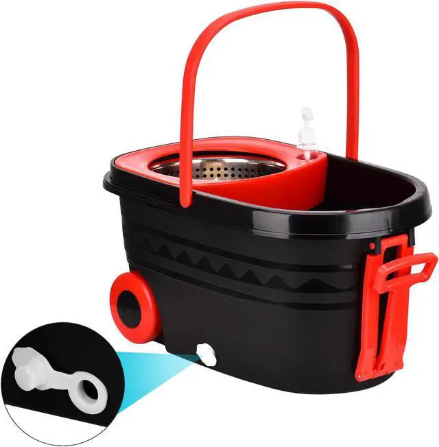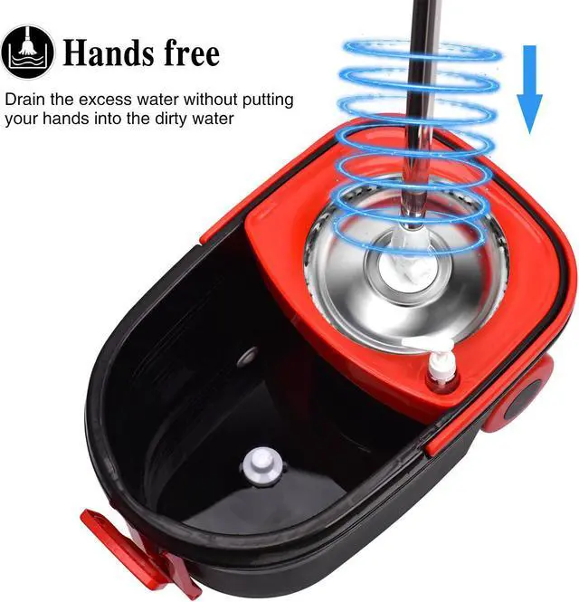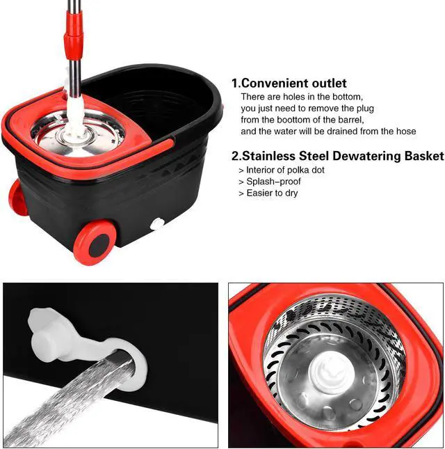Easy to moveMop Bucket with Wringer on Wheels, All thoughtful designs make this mop and bucket easy and convenient to use. The mop bucket is equipped with large wheels and 2 handles for easy movement during cleaning. Easy to useThis rotating mop and bucket system has an agitator in the reservoir for rotating and washing dirt. Through this self-washing and wringing action, there is no need to touch dirty water or dirty mops, and your hands are kept clean and dry. High-quality materialMore sturdy mop handle and bucket, the basket, wringer, plate and handle of the rotating mop bucket are made of durable 304 stainless steel and PP.