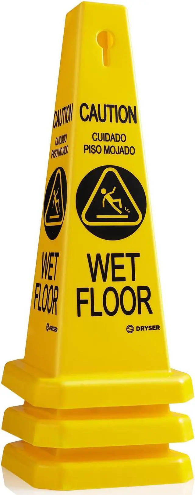 Alert your customers, employees, and pedestrians from potential slip-and-fall hazard with Dryser 3-Pack 26" Caution Wet Floor Cones. Ideal for all floors, doorways, and narrow walkways in professional, residential, and commercial environments, our cones are ideal for high traffic areas. Our bright color, bold text and distinctive graphics are easy to see and read from a distance with the warning message printed in both English and Spanish. The cones four-sided design measures 26-1/2" high x 11" wide. Our cones provide extra stability to keep from being easily knocked over and the stackable design makes for space-saving storage.