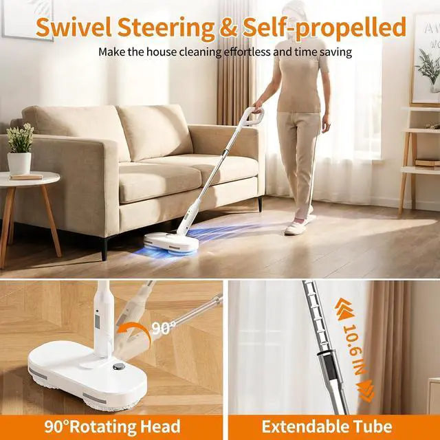 Special Features: Features a 180°rotating mop head with embedded LED headlights to illuminate pet hair and dust particles. With an integrated one-touch water spray button, Electric Floor Mop cleaning your home has never been simpler and less of a chore