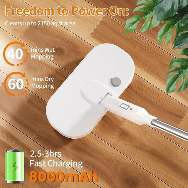 Extended Battery Life: Our Cordless Mop is designed with a 8000mAh battery for an extended lifespan that can mop up to 2000 square feet of real estate on a single charge. This translates into 50-80 minutes of continuous use. With an embedded smart display that reads the battery status, you'll know exactly how much juice you have left