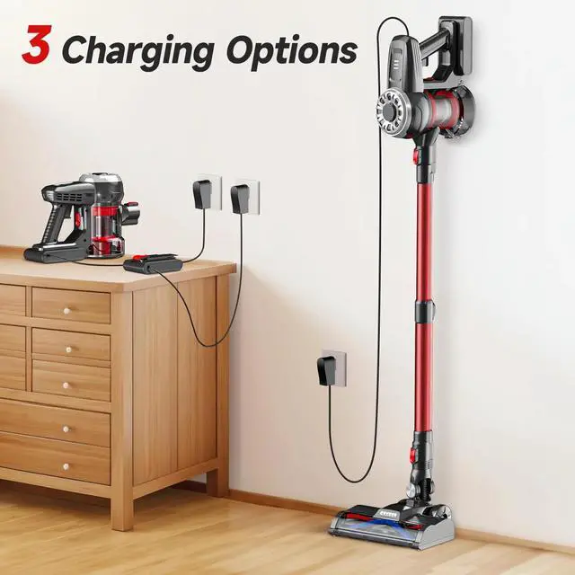 Transform your cleaning routine with this sleek cordless stick vacuum in vibrant red. The telescopic design offers versatile cleaning options - use it as a full-length vacuum or adjust for compact storage and handheld operation. With two power settings, enjoy up to 45 minutes of runtime on regular power or 15 minutes at full 15kpa suction strength. The vacuum features practical additions like LED headlights for visibility in dark corners and a triple indicator light system showing remaining battery power. The removable, rechargeable battery pack adds convenience, while included accessories like a crevice tool and dust brush help tackle various cleaning challenges. The easy-to-empty dust bin makes maintenance simple. Perfect as either a primary household vacuum or secondary cleaning tool for specialized tasks in basements, garages, or around pet areas. The straightforward design focuses on essential functions without complicated displays or controls, delivering reliable cleaning performance when you need it.