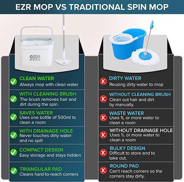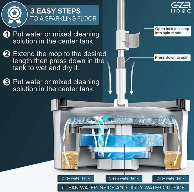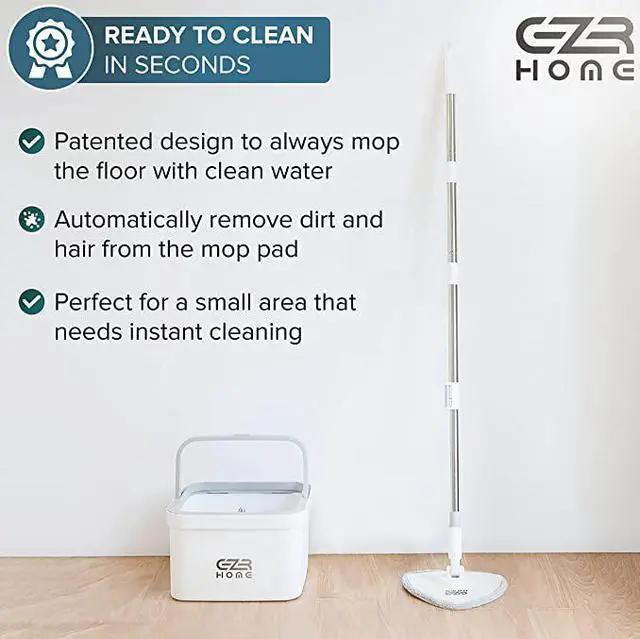 EZR HOME Floor Mop comes with a patented filterable water system that makes every spin or cleaning highly effective. The cleaning tools system of the mop bucket separate dirty water jets out filtered water and the brush scrubs all dirt and hair away. Your hands won't get wet because you can wash the pads in the bucket without a washing machine for this mop bucket with separate dirty water. The ultra-absorbent microfiber mop pad doesn't consume gallons of water to clean the floor. Mop with bucket with spinner removes stubborn dirt while being machine washable and easily replaceable.