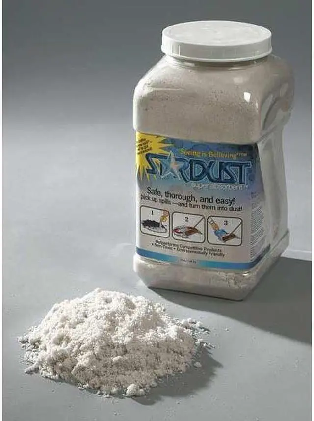 - STARDUST Super Absorbent 5-Quart Dispenser Bottles Order in multiples of 6. Handy dispensing unit to easily carry it to the spill location. STARDUST instantly absorbs spills of hazardous or non-hazardous liquids and greases, including oils, fuels, bio fluids, paint, and acids. Absorbs up to 10 xs more than clay-type (kitty litter) for a much lower product-cost-per-use and lowering disposal costs up to 80%. Resealable zip-lock bag design. STARDUST is environmentally safe and friendly. Refill with STARDUST Super Absorbent bags. (D15CF)
