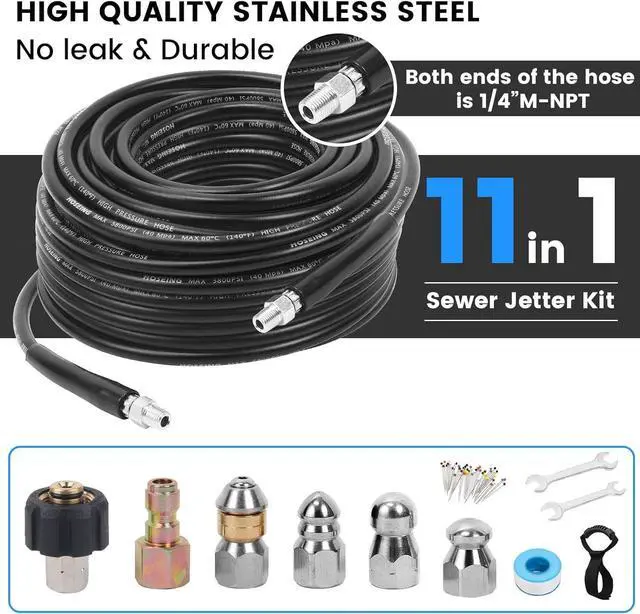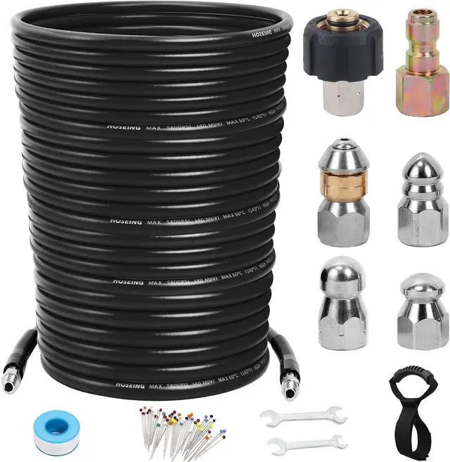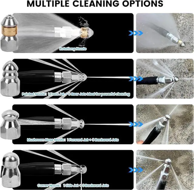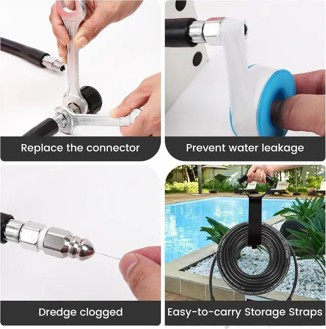Our special quality handle storage straps are easy to carry and save storage space. The pearl brooch helps you clear clogged nozzles and the tape helps prevent leaks. Can be used for a variety of cleaning purposes such as cars, motorcycles, floors, windows, driveways, roofs, siding, gutters, bathrooms, outdoors and indoors. Get the New Family Set 6 Heads Sewer Jetter Kit today!