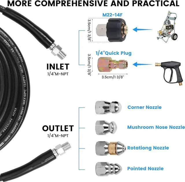 With our quick connect plugs and metric M22 to 1/4 inch female Npt fittings. The quick connect plug is ideal for exchanging pressure washer outlets, sewer jetter hoses, guns, and nozzles. It ensures a solid connection with the quick coupler every time. The pressure washer coupler converts metric M22 14mm male NPT thread to 1/4" Female NPT.