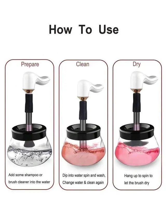 Easy to Use Makeup Brush Cleaner: Just 3 steps to easily use this electric makeup cleaner and dryer. 1. Attach the brush to the spinner. 2. Pour water and soap into a bowl. 3. Dip and spin to clean, lift to spin to dry, this automatic makeup brush cleaner will free your hands and save you a lot of time.